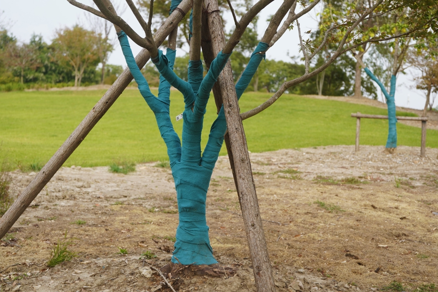 包扎与打上支柱架的乔木。 冯蕊 摄