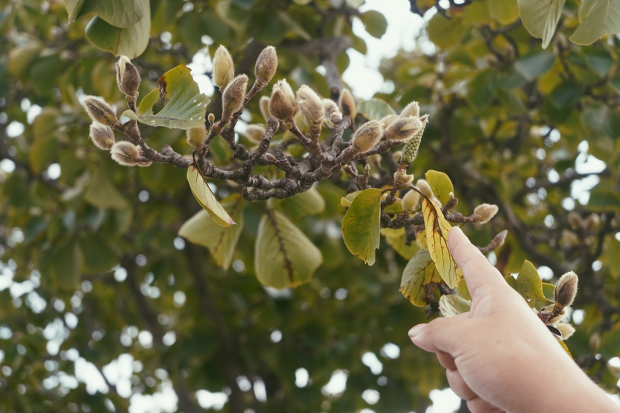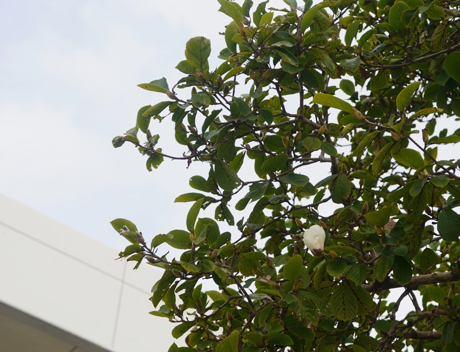 在辰山植物园,春季才有的白玉兰冒出了一个花骨朵。