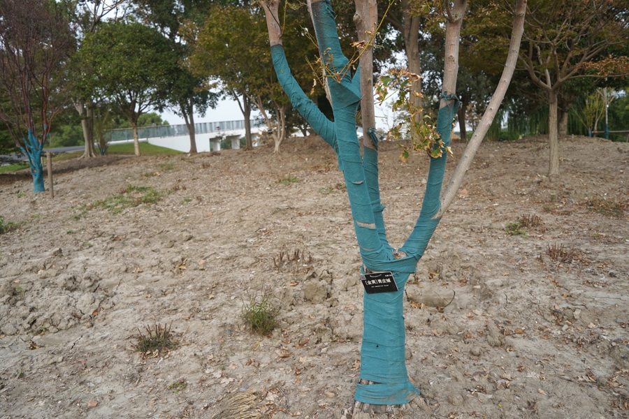 陈嫣妮和共事又找来蓝绿色的布条,把一些得不到荫蔽的宏大树干包得严严密实。每隔七到十天,就对易晒伤的树叶打一次扼制蒸腾的药剂。